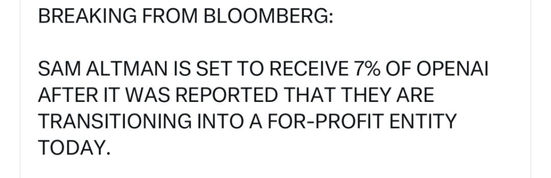 2、OpenAI正考虑成为一家公益公司,同时讨论让CEO奥特曼(Sam Altman)持有公司7%的股份。