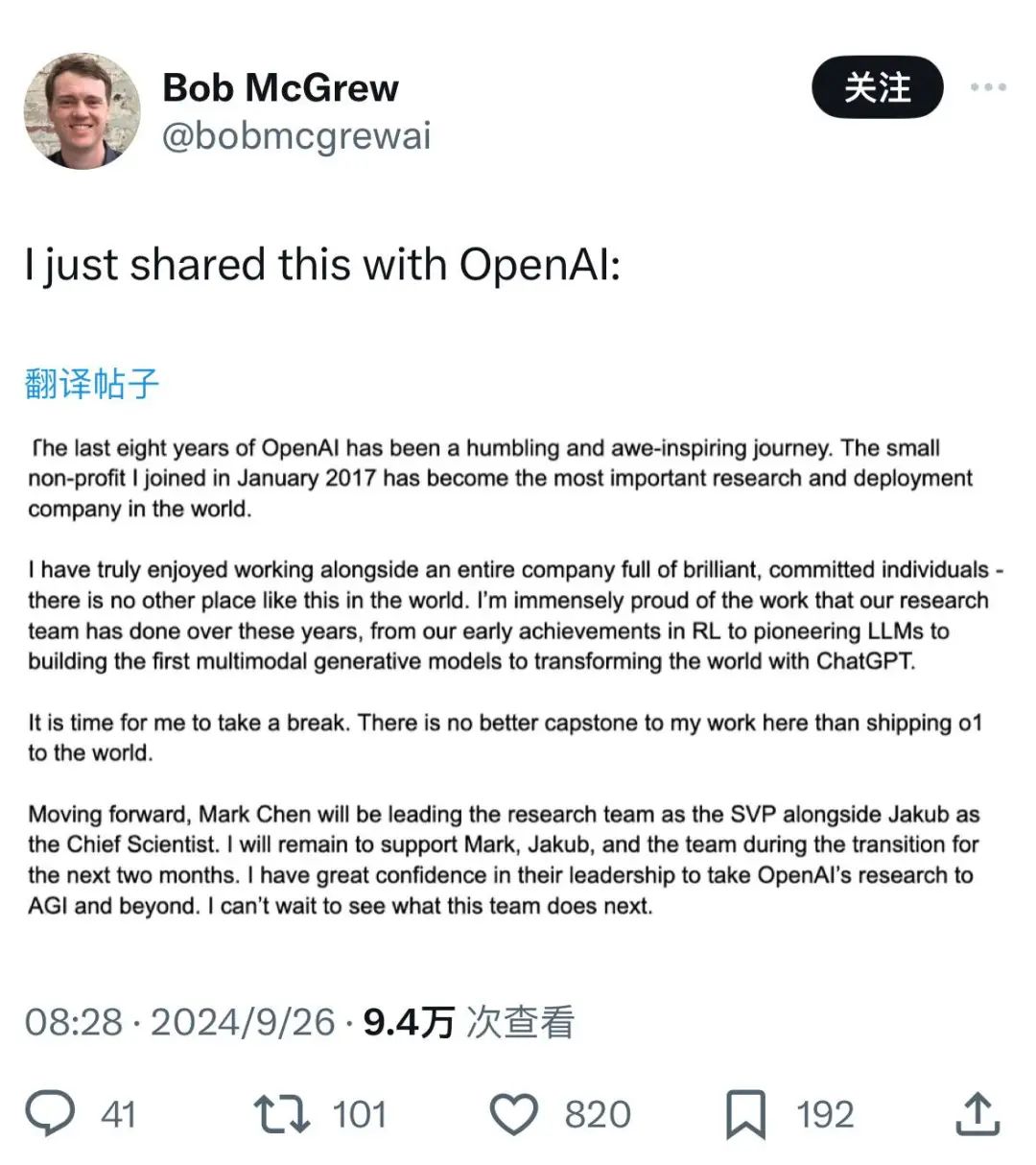 在Mira发布离职后不到几个小时,OpanAI首席研究官(CRO):Bob McGrew,随即也宣布离开,他提到他在2017年1月加入OpenAI团队,到如今这家公司已经成为全世界最重要的AI企业之一。同时接下来两个月,他会继续支持继任的同事平稳过渡。