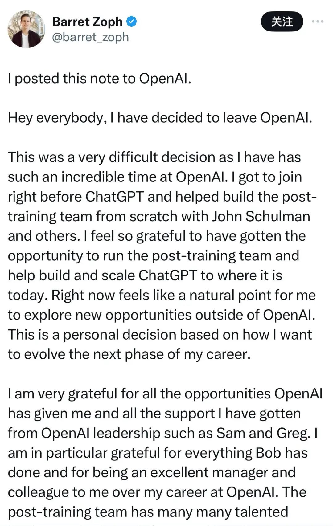 OpenAI副总裁Barret Zoph(负责后期训练研究)也在同一时间宣布离职,他曾在谷歌担任安全科学家,在2022年加入OpenAI,他在公开信中表达,离开是一个非常困难的决定,也对团队表达了感谢。
