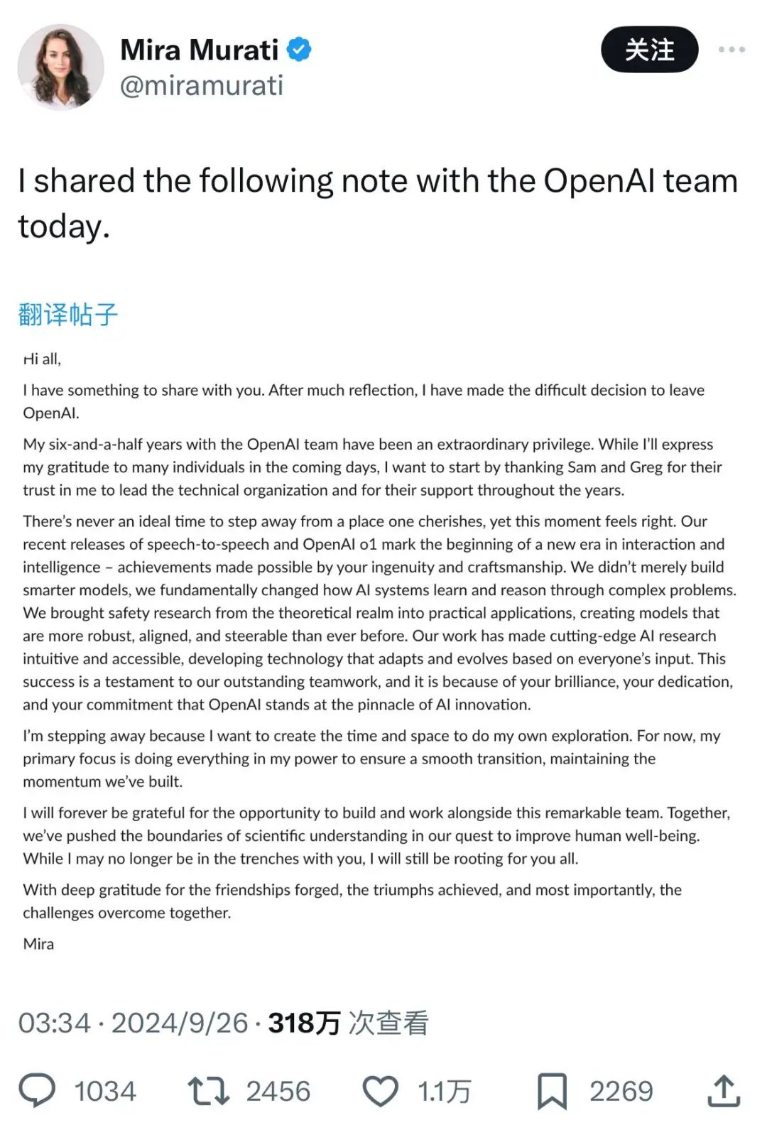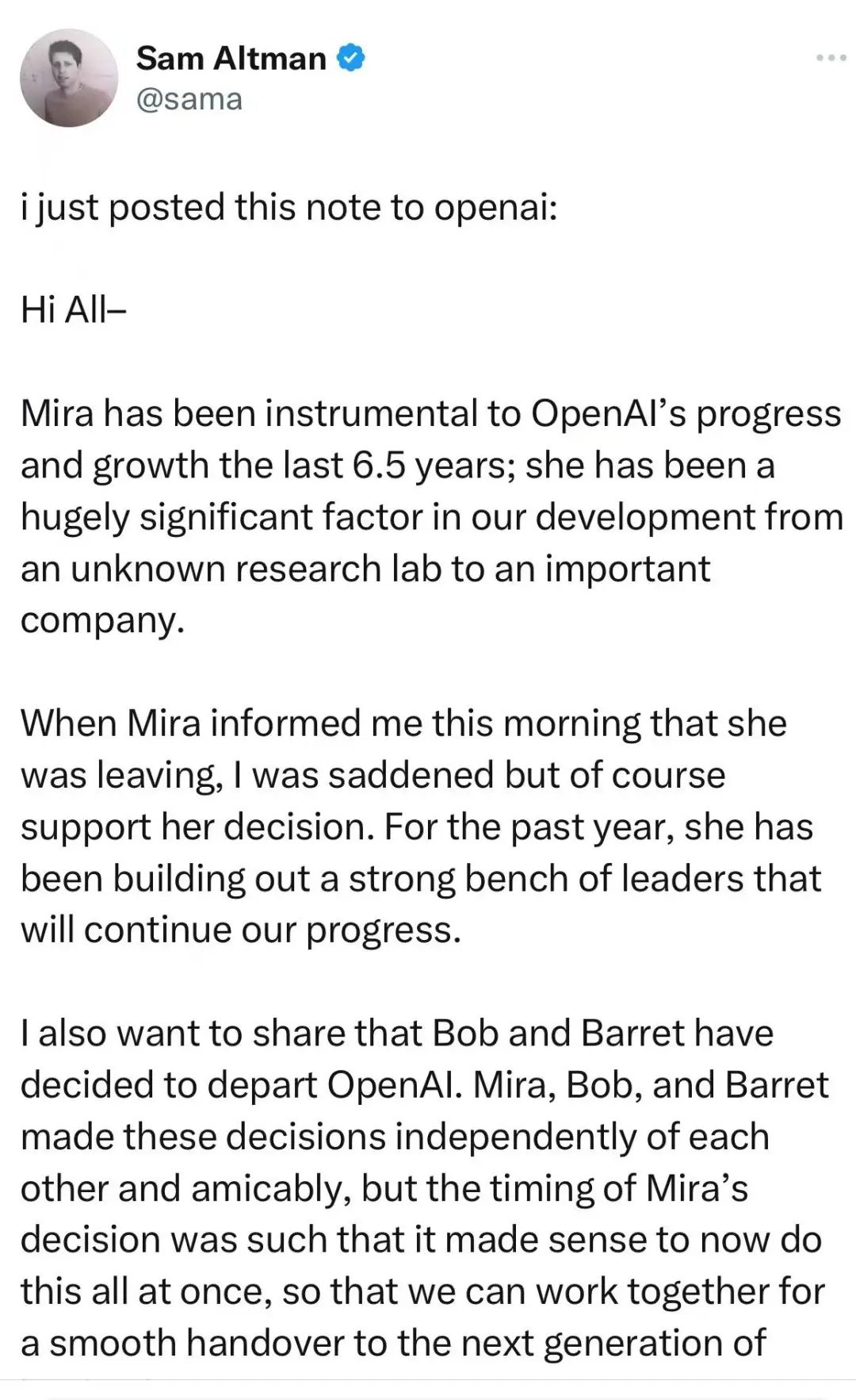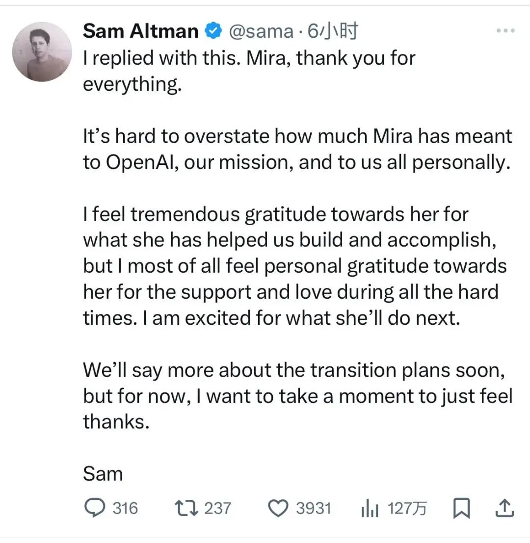 奥特曼解释了他今天早上刚刚得知CTO Mira要离开的消息,表达悲伤的感受,随后也详细提及了其他俩位核心领导人员也要离开。