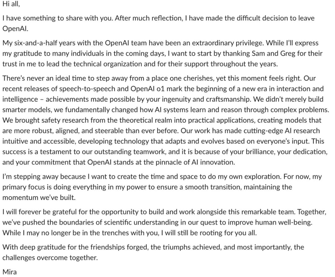 There's never an ideal time to step away from a place one cherishes, yet this moment feels right. Our recent releases of speech-to-speech and OpenAl o1 mark the beginning of a new era in interaction and intelligence - achievements made possible by your ingenuity and craftsmanship.