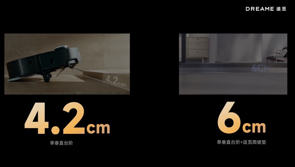 常规环境下,追觅X50系列能够应对单垂直台阶,最高越障高度为4.2cm;搭配其专属的爬坡垫使用,可实现最高越障高度达6cm。
