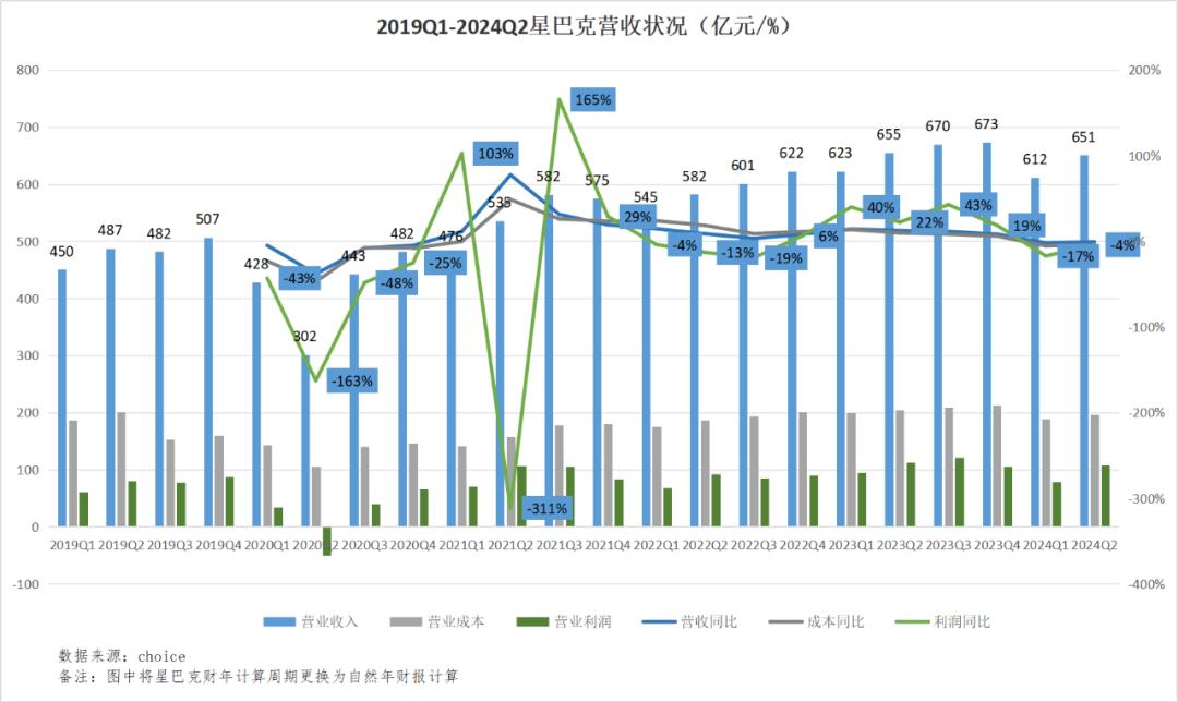 星巴克集团过去五年的财报显示,除2020年疫情影响导致的低营收基数,大部分年份增速平缓,但营收体量保持稳定。最大幅度的调整发生在今年上半年,营收连续两季度下滑。