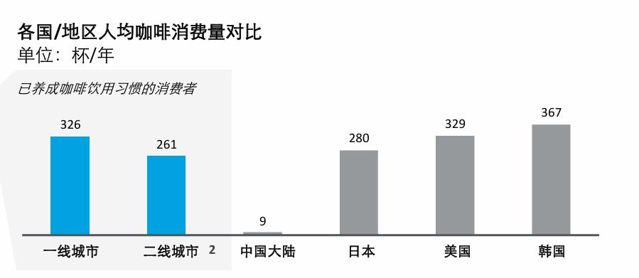二是,尚未被激发的广泛下沉市场。报告指出,国内一、二线城市已养成咖啡饮用习惯的消费者,其人均年消耗量分别为326杯、261杯。相比之下,全国范围这一数据为9,这也意味着广大下沉市场被平均,其真实消耗量远低于9杯。