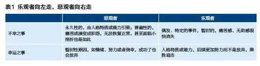 认知心理学认为,影响我们情绪的不是事件和结果本身,而是我们对它们的看法和认知。悲观者和乐观者在遇到挫折或者幸运之事的反应显著不同(表1)。我根本就不适合做销售,领导已经是第二次公开指责我了——我在他心目中已经属于“收拾书包滚蛋”行列了吧;我真的好差,这是我第三次犯错误了;我的命运也太“杯具”了吧……这是悲观者的常有想法。乐观者则可能会想,“爷做不了销售,可以干别的”,“领导是为了促进我的进步,是不拿我当外人”,“圣人君子不贰过,或者这个问题太难了”,“天生我材必有用”,等等。