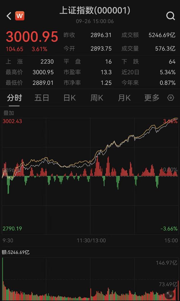2024年9月26日,A股、港股均迎来大涨。当日,上证指数收盘上涨3.61%至3000.95点,深证成指收盘上涨4.44%至8916.65点,创业板指数收盘上涨4.42%至1714.14点。
