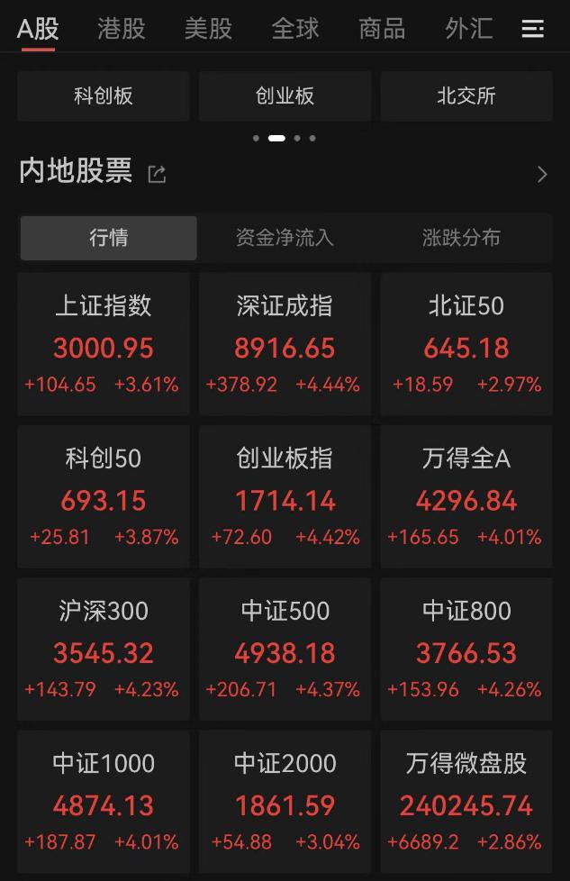 截至收盘,上证指数涨3.61%,上涨超过100点,一举收复3000点关口,深证成指收盘上涨4.44%,创业板指数收盘上涨4.42%。港股方面,恒生指数收盘上涨4.16%,恒生科技收盘上涨7.27%,恒生中国企业指数上涨4.75%。