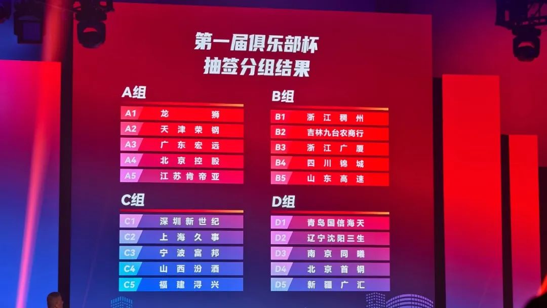 在发布会现场,首届CBA俱乐部杯赛进行了抽签分组仪式。其中广州、天津、广东、北控、江苏处于A组;浙江、吉林、广厦、山东、四川位于B组;深圳、上海、宁波、山西、福建位于C组;青岛、辽宁、同曦、北京、新疆则落入D组。