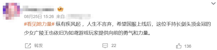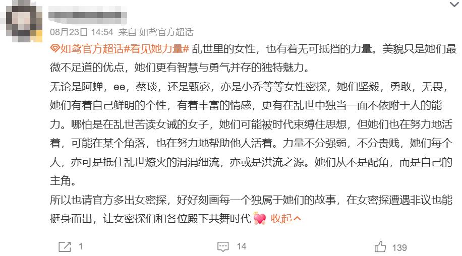 再比如,《如鸢》线上联合新浪新闻发起#看见她力量#话题征集活动,也是在变相强调女性作为主体的力量,引导玩家去体会女性存在的多样性。