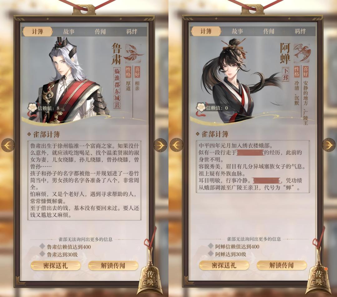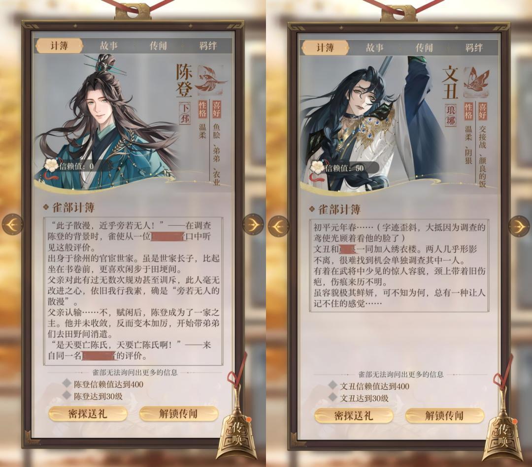 而且密探和玩家、男主、其他密探之间有不同的关系故事。有些信息藏在密探名册里,有些碎片式剧情穿插在主线和活动故事中。这使《如鸢》的人物关系变得错综复杂,但也更能真实反映出群雄争霸背景下的群像悲欢。