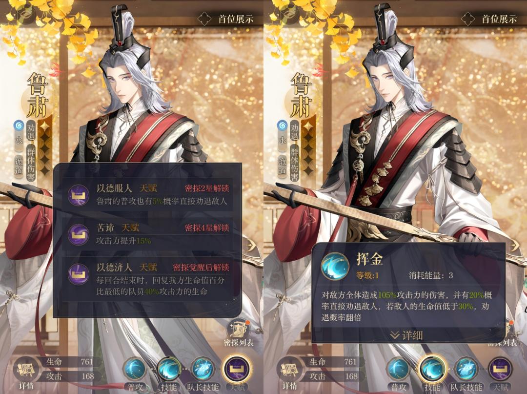 密探鲁肃的技能、普攻,有概率触发劝退 直接让敌人逃跑,不战而胜