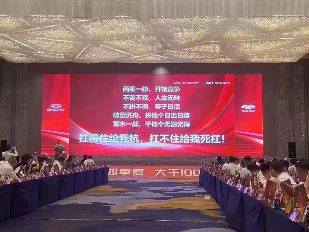 如果只看这几个字,还以为是哪家汽车经销商在“打鸡血”,实际上这是奇瑞汽车的年底冲刺大会。很多人在看到这张图时并没有太大的反应,但更多人发现里面有一个错别字“抗”。不难发现,今年汽车厂商的压力确实太大了。