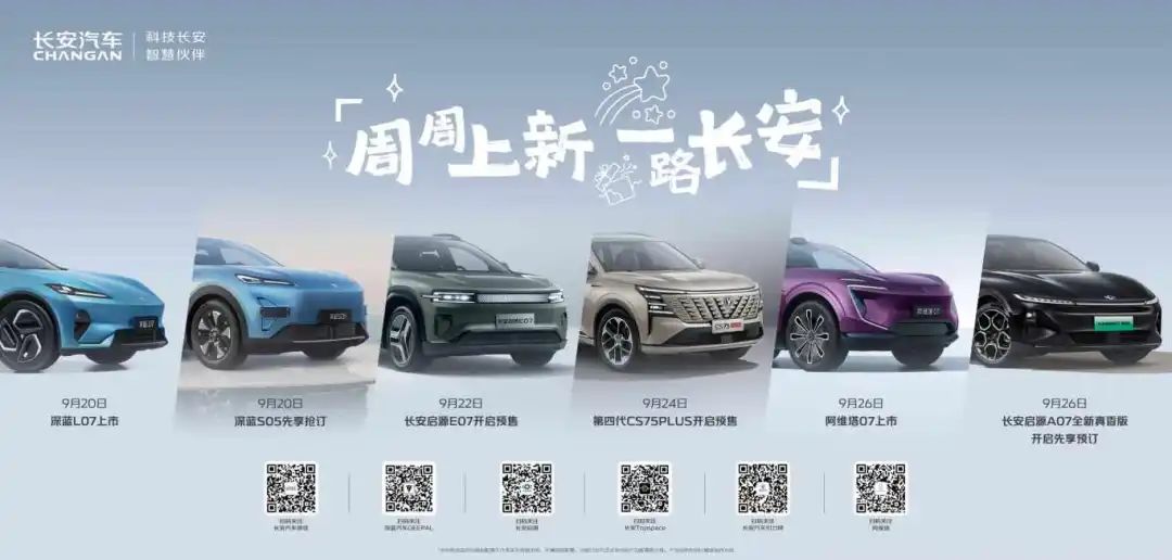 而另一家国企长安汽车同样不遑多让,在9月20-26日这一周,直接拿出“周周上新,一路长安”的海报,公布6款新车上市或亮相,分别是深蓝L07上市、深蓝S05先享抢订、长安启源E07开启预售、第四代CS75PLUS开启预售、阿维塔07上市、长安启源A07全新真香版开启先享预订。