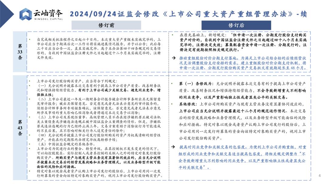 - 针对大市值 + 信息披露优秀的上市公司,并购类行政审批采用简易程序,提升头部上市公司的并购支付能力;