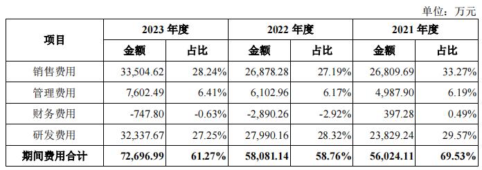 从报告期内,合合信息的期间费用率(含研发费用)分别为69.53%、58.76%和61.27%。其中销售费用和研发费用占大头。据招股书,公司销售费用率与同行业水平基本一致。