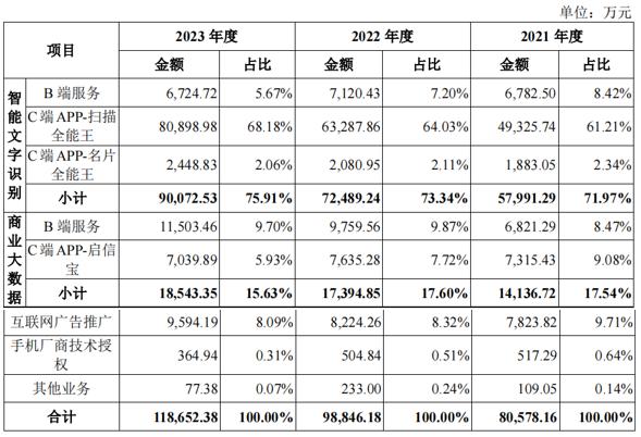 智能文字识别业务包含扫描全能王、名片全能王C端APP收入以及B端服务收入,C端APP扫描全能王所产生的收入为报告期内公司核心收入来源,占比维持在60%以上。