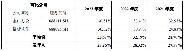 报告期内,公司毛利率分别为83.44%、83.70%和84.25%,与可比上市公司金山办公差异不大,但低于可比上市公司福昕软件;主要原因在于福昕软件主要产品为标准化软件,可复制性强,边际成本较低,对应的规模效益更为明显,故毛利率较高。