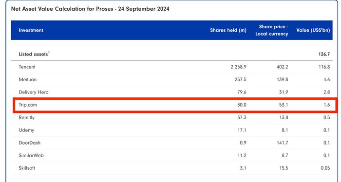 互联网投资公司Prosus清仓携程持股,套现约16亿美元