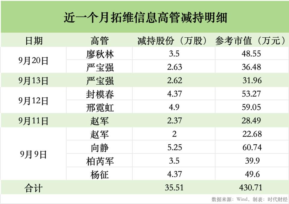 从可以合规减持的第一天开始,就不断有拓维信息高管售出自己手中的股票。据时代财经统计,在9月9日到9月26日这半个多月里,邢霓虹、严宝强、赵军、向静、封模春、柏丙军、杨征、廖秋林等8名高管,均已完成他们减持计划,合计减持35.51万股,套现430.71万元。