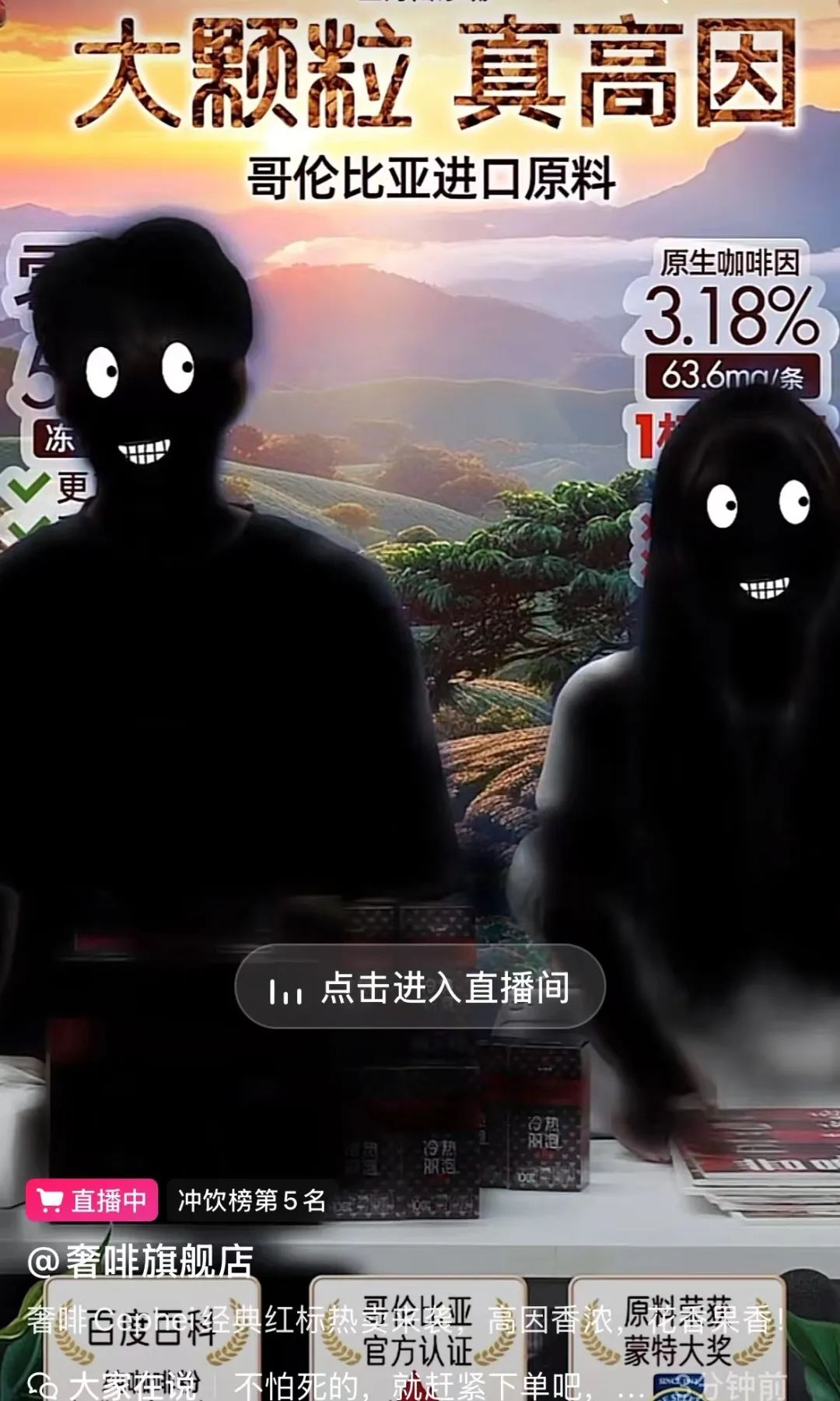 风格上整活不出新东西的直播间,就会在其他形式上大卷特卷,比如“奢啡黑咖啡”直播间,两个主播都被变成了“黑人”,看不见具体长相,只留下了黑色轮廓、两只眼睛和一个嘴,账号粉丝数5万左右,单场直播最高观看人次超过12万。