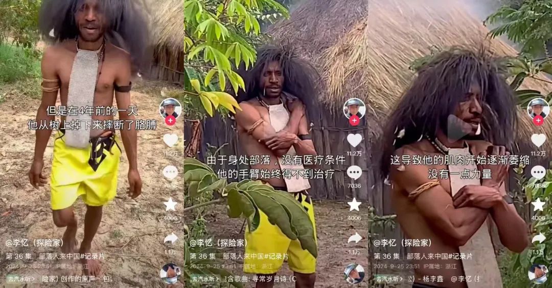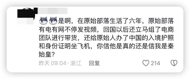 有网友指出“剧本有点熟悉,曾经有一群人抓走原住民去种植园,现在换成了带货”,还有网友对原始人身份提出质疑:“没身份、没护照、没签证,是怎么从原始部落到国内带货的?”