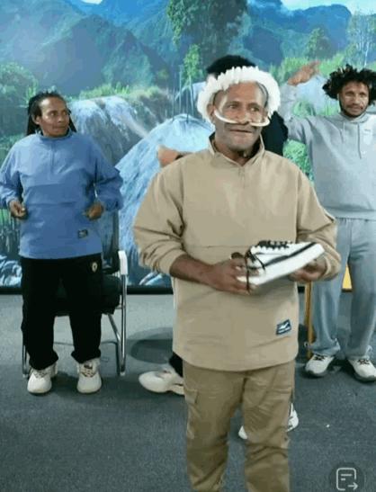 另外两位虽不似大娘这么兴奋,但也蹦得很是欢快。鼻子里塞野猪牙的原始人大叔看起来有点拘谨,没想到轮到他站在镜头前时,大叔跳出了“街舞style”,腿部动作不断变换,颇有些艺术细胞在身上。