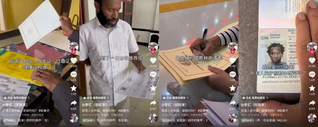 带没有身份的原始人回国不是一件容易的事情。李忆在视频里解释,光是身份证明就办了半个多月,先后办理了信仰证明、身份证、户口卡、出生证、结婚证、健康证、通行证等等,拿到了市长推荐信,但依旧不能直飞中国,要从巴布亚飞辗转几地飞到雅加达,雅加达飞往巴厘岛中转,再花半个月办理国际身份和护照、拿到中国签证,最终才能飞回国内。