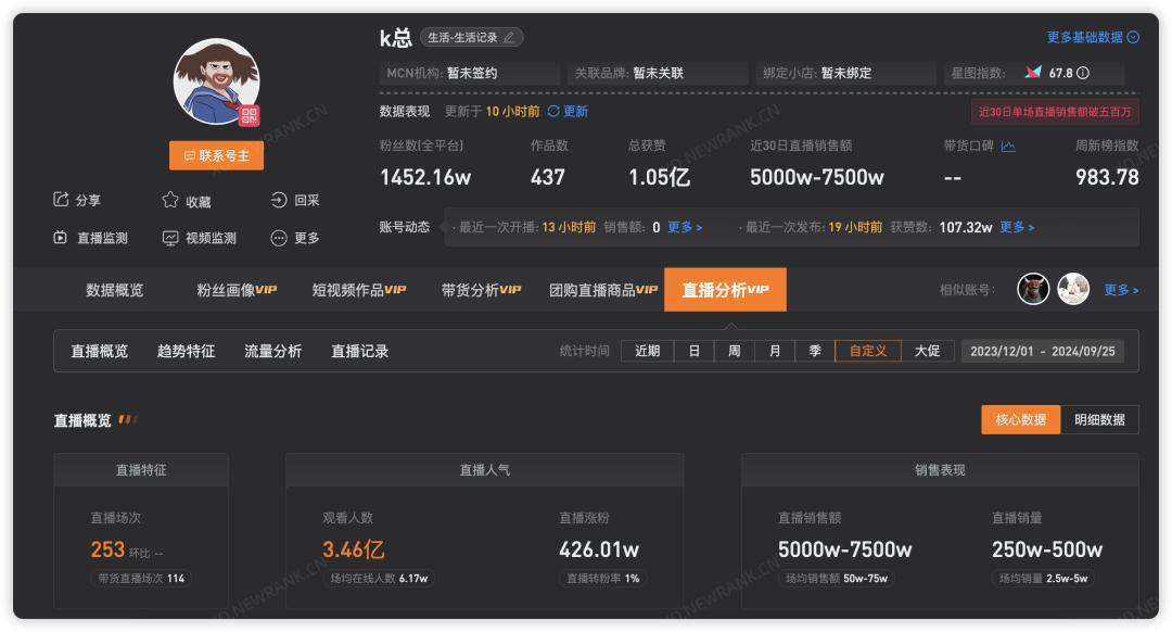 就像前段时间爆火的“k总”,靠抽象直播带货一个月涨粉超千万,新抖预估其近30天直播销售额达到5000万-7500万元。