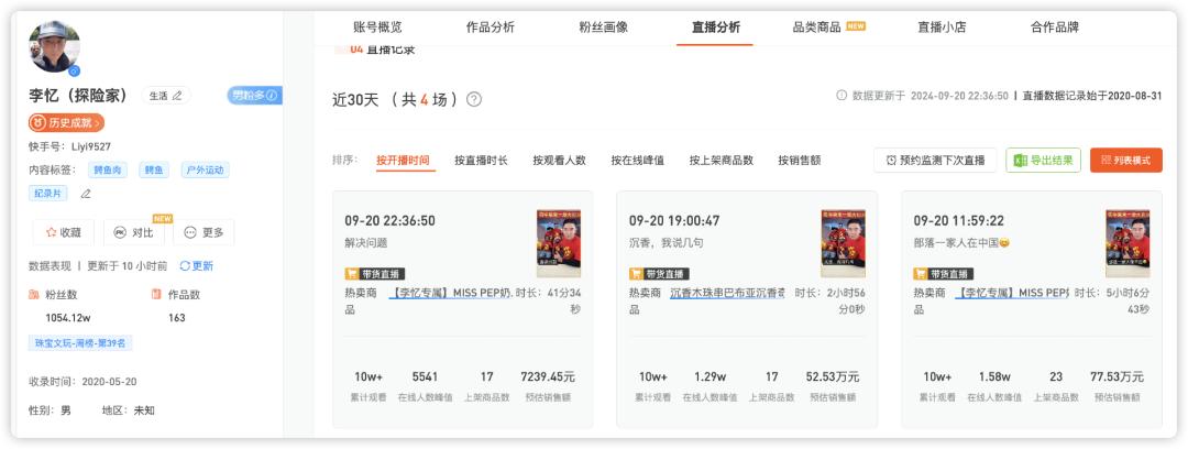 很多人不知道的是,9月20日,李忆也带着这几个原始人在快手做了一场带货直播,话题度虽不及抖音这场,销售产品也不一样,但销售额也很可观,新快数据显示其一天带货超过130万元。