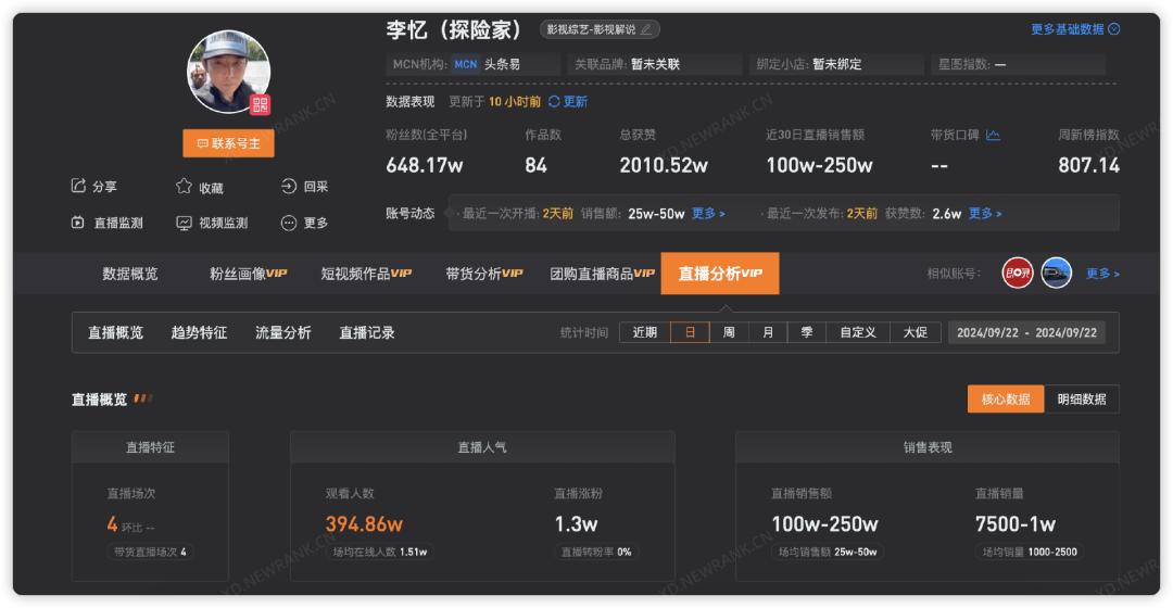 新榜旗下抖音数据工具新抖显示,9月22日当天李忆直播间的观看人次近400万,带货销售额预估达到100万-250万元。话题