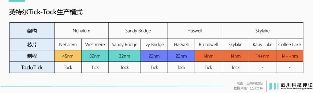 基于IDM的架构,英特尔制定了名为tick-tock生产模式:即以两年为一个单位,“tick年”侧重芯片制造,更新芯片制程,“tock年”侧重芯片设计,更新架构。