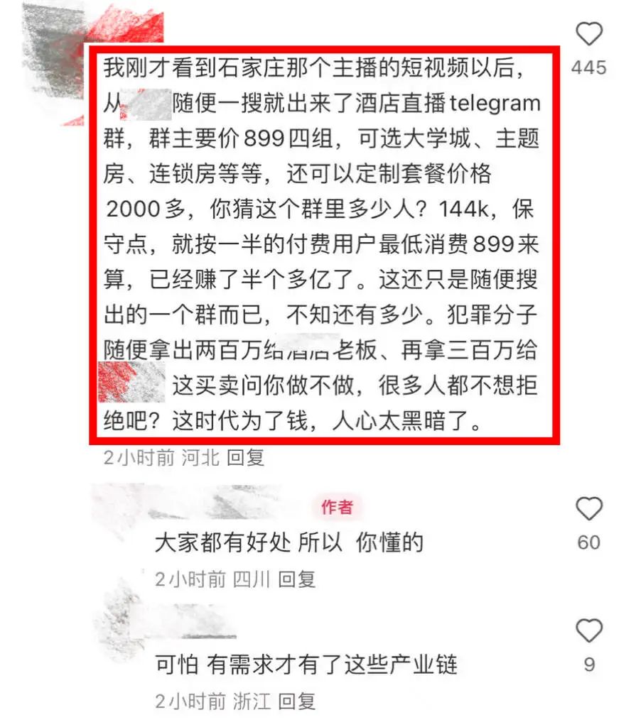 暴利是引诱人疯狂扣动犯罪手枪的板机。这些专注于酒店偷摄直播的频道和群里的观众已经猖獗到了什么程度?简单来说就是令人发指。