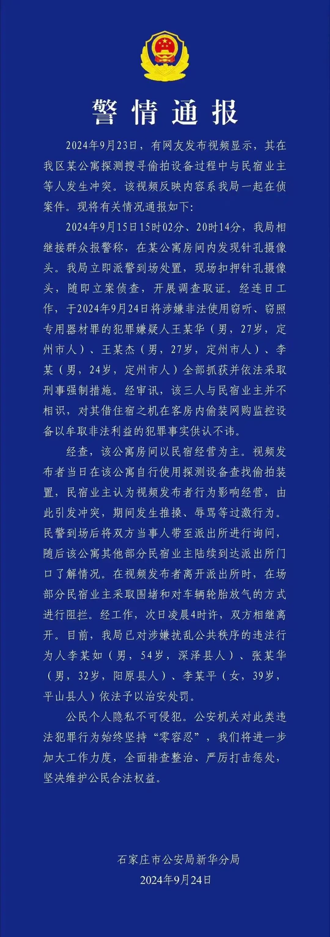 截至当前,石家庄市公安局新华分局已就此事发布了官方警情通报,安装针孔摄像头的不法分子已被抓获,涉嫌扰乱公共秩序的民宿业主等已被依法予以治安处罚。