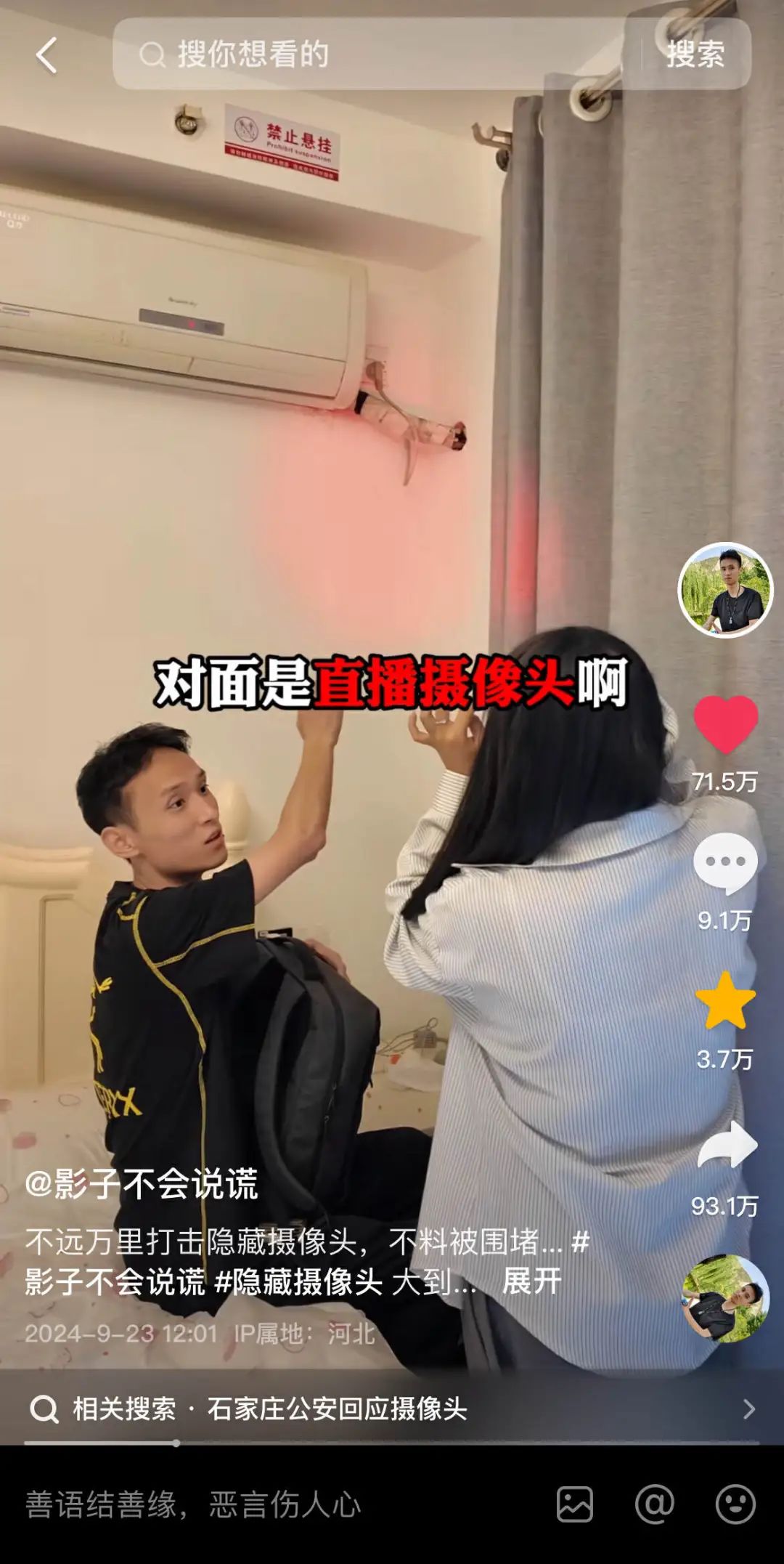 9月23日,自媒体博主“影子不会说谎”,曝光了在河北石家庄某广场的酒店民宿内发现数个隐藏摄像头的视频。