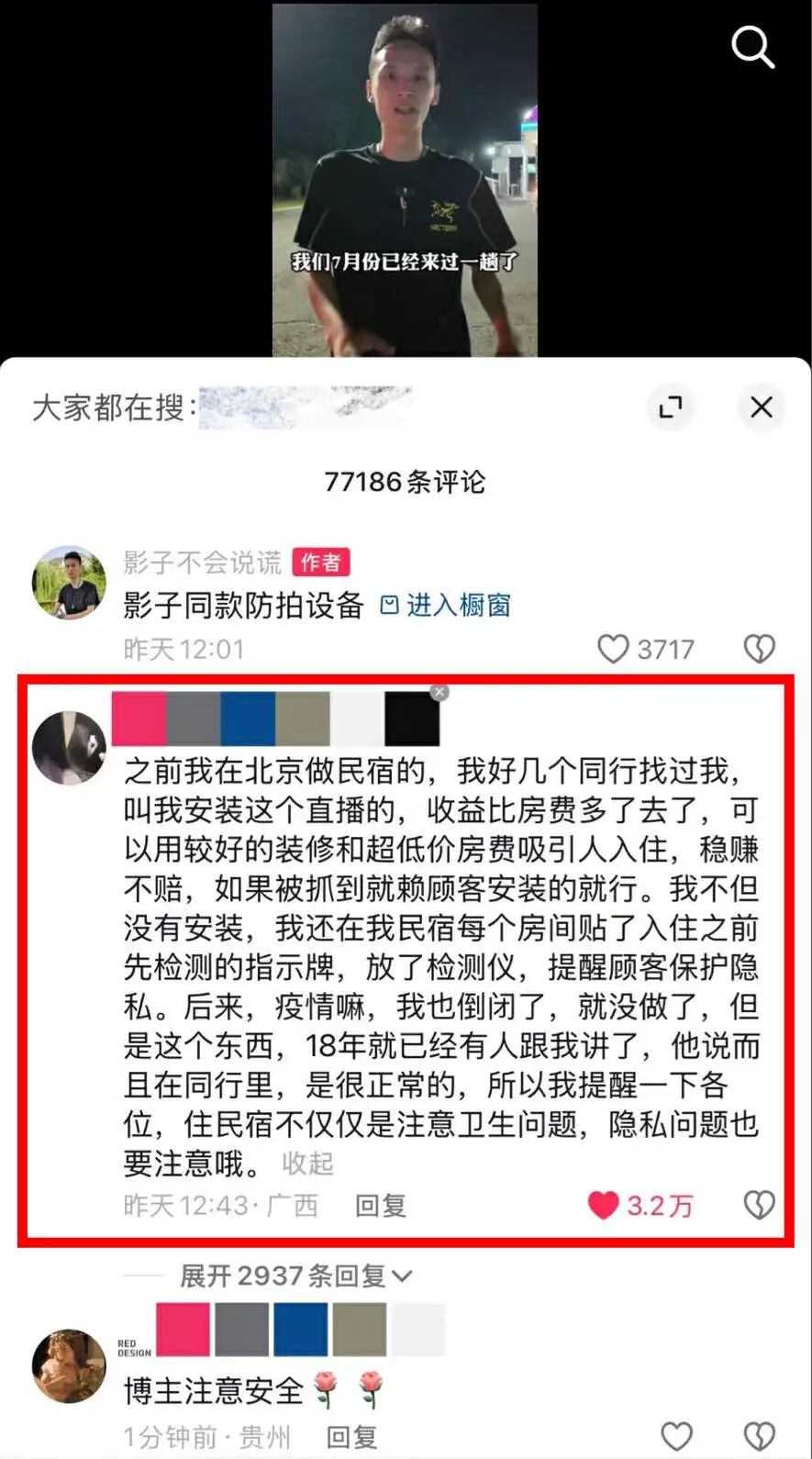 评论区还有自称前民宿老板的网友,说曾经是有好几个同行找过他,游说他安装隐藏摄像头盗摄直播获利,“收益比房费多了去了。”