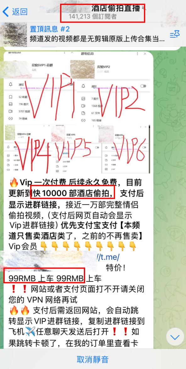 就在这个超14万订阅的酒店偷拍直播群内,组织者宣称他们共设有至少5个VIP频道,支付99元可以开通VIP资格,在今年6月的群公告中,称已经更新了快10000部酒店偷拍视频。