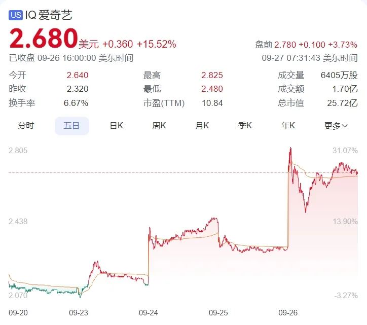 但在9月24日,爱奇艺美股一天暴涨14%。虽然9月25日迎来回调,但9月26日继续大涨15.52%,27日盘前继续大涨超过5%。
