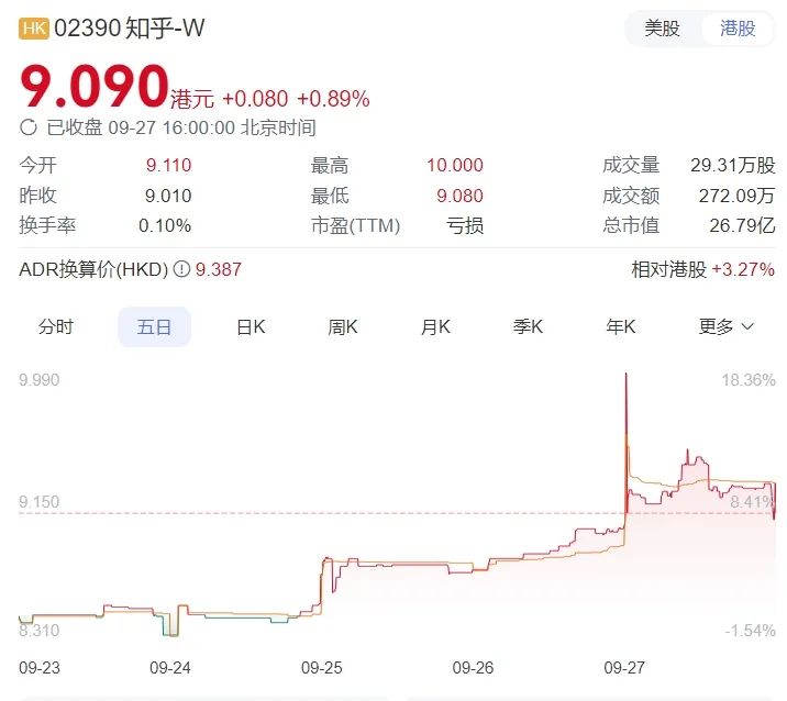 知乎的交易量更是暴涨了数十倍,9月24日,知乎港股成交额达到了38.87万,股价大涨4.69%。9月27日成交额达到了272万,股价涨0.89%。
