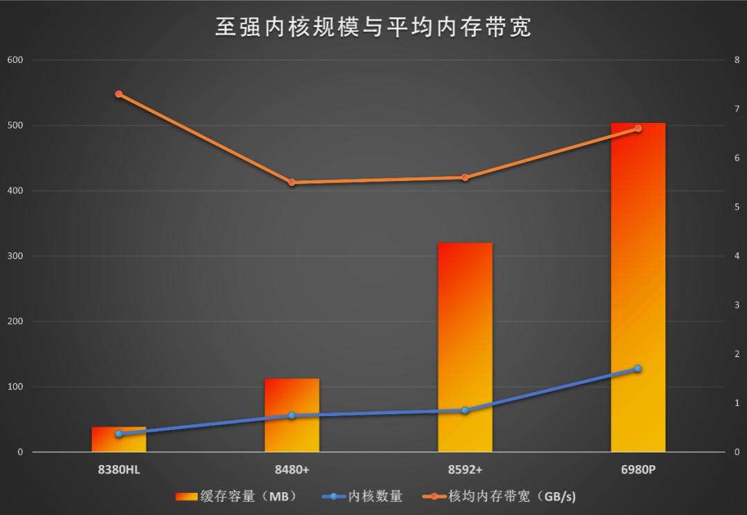 2、DDR5内存双管齐下提升带宽。至强6900系列支持12通道DDR5 6400,总带宽可以达到614GB/s,平均每核的带宽大致还有5GB/s的水平。6900P还支持新型内存MRDIMM,频率提升至8800MT/s,总带宽达到了845GB/s,平均每核6.6GB/s,也明显超过了前两代产品,大幅度逆转了内核数量增加、平均内存带宽不升反降的问题。