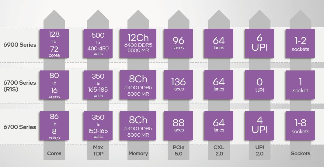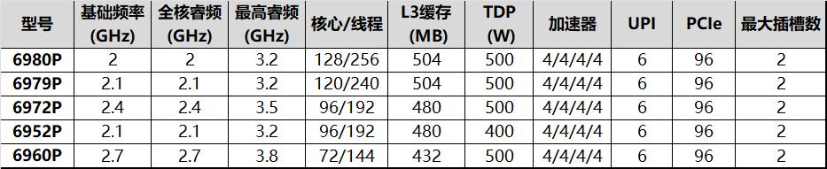 缓存规模、前端宽度以及矢量单元的差异,使得至强6性能核和能效核有不同的定位。早先发布的至强6能效核更适合微服务等运算强度相对较轻,可在高核心数量和规模扩展方面收益的任务,以追求更高的能效、更高的机架利用率。而现在发布的至强6性能核更适合大数据、建模仿真等计算密集型和人工智能任务,为高性能优化,单颗处理器的功耗直飚500W——当然,跟同期发布的Gaudi AI加速器的新品或类似的加速器产品相比,能耗是应有的代价,能力提升性能上限才更为重要。