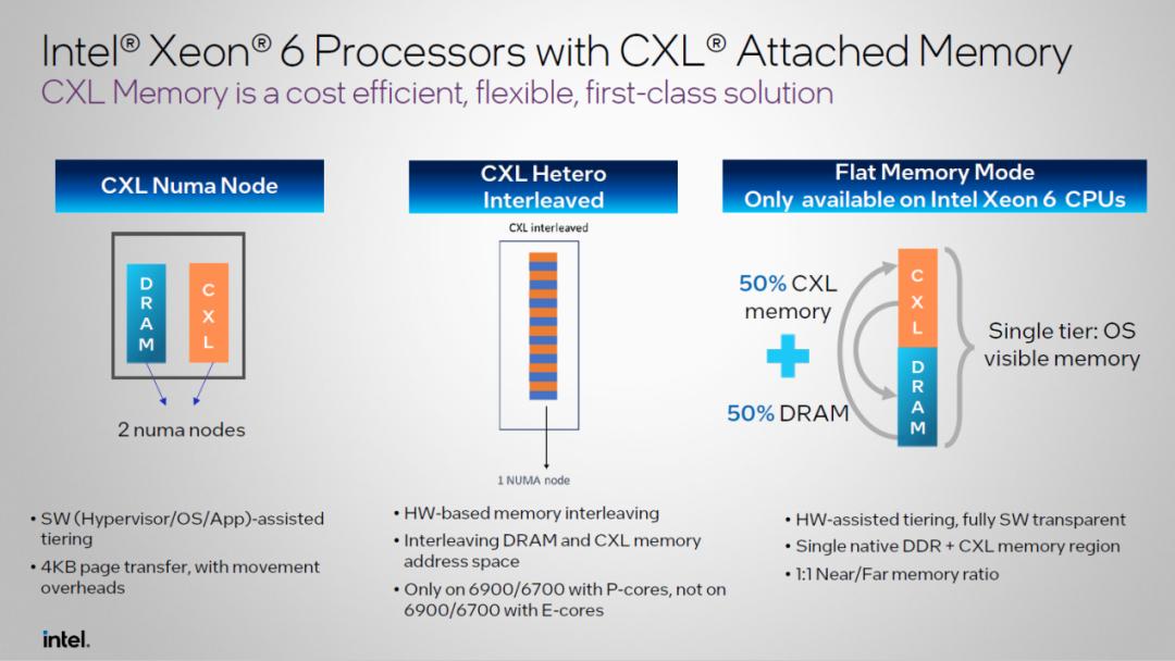 这里重点说一下CXL内存的优势。CXL2.0支持链路分叉,使一个主机端口可以对接多个设备,而且提供更强的CXL内存分层支持,可实现容量和带宽扩展。至强6支持3种CXL内存扩展模式:CXL Numa Node、CXL Hetero Interleaved、Flat Memory。