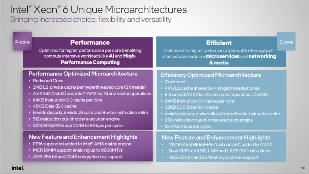 能效核的指令缓存与性能核都是64KB,但数据缓存分别是32KB和48KB。前端的指令解码器宽度也有差异,分别为6和8宽。指令乱序执行引擎差异较大,能效核是256条而性能核是512条。能效核不支持性能核所支持的AVX-512和AMX,这也可以明显减小矢量运算单元的晶体管占用,但代价是每周期的单精度浮点运算次数有了数量级的差异。但能效核也改进了AVX2,增加了VNNI的INT8和BF16/FP16快速转换,这样在处理AI应用的时候表现也还有所改善。另外,其256位加密和1024/2048密钥也获得了能效核的支持,确保至强6平台的安全水平基本一致。