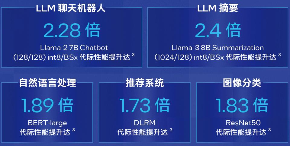 此外,至强6900P的UPI2.0链路速率提升到了24GT/s,数量增加至6条,使得双路互联效率进一步提升。结合内核数量、内存带宽等方面的全面提升,至强6900P可以被视作高算力+高存力平台的最强机头,不论是科学计算,还是AI集群。根据已透露的测试,至强6900P平台的数据库、科学计算等关键应用负载的表现是上一代产品的2.31倍-2.5倍,AI应用性能是其1.83倍-2.4倍不等。