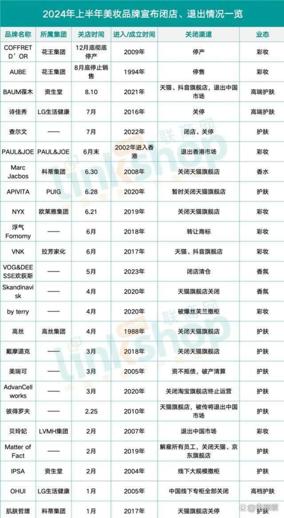 比如越来越多的韩系日系欧美系美妆品牌逐渐退出中国市场。据不完全统计,上半年至少超过20个品牌宣布闭店或者退出中国,甚至有曾经大火的贝玲妃、NYX等等。