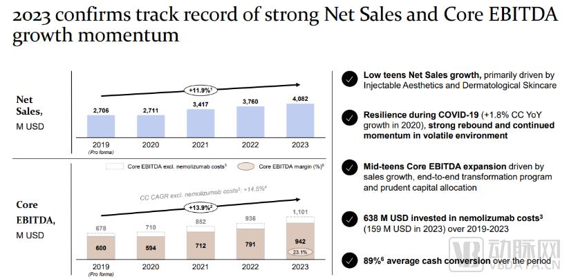 在医美领域,高德美拥有显著的竞争优势。根据高德美2023年全年财报,年度净销售额首次突破40亿美元大关,达到40.82亿美元(约合人民币294.94亿元),同比增长8.5%。同时,在肉毒毒素两位数增长的推动下,注射美学业务净销售额增长6.5%,填充剂和再生刺激剂在国际市场上取得了市场份额扩张,并在美国市场夺得一名。