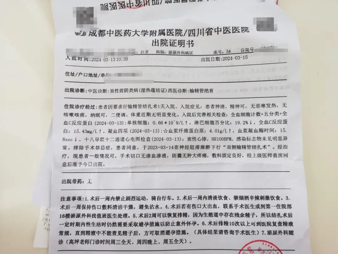 今年3月份,小阳决定去做结扎。他查了越多信息,越觉得应该趁着这个年纪抓紧去做。他担心未来会有什么严格的规定来阻挠他做这个手术。在检索过程中,他发现很多人推荐成都中医院的泌尿外科,于是马上从北方动身去到成都。
