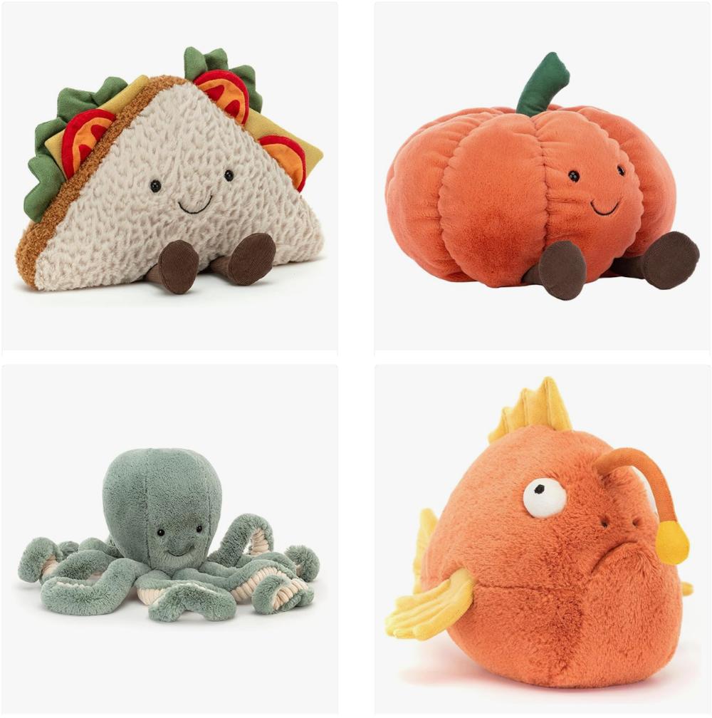2014年,Instagram和Facebook等社交平台的兴起,让年轻人的分享欲爆棚,Jellycat开始突破传统动物形象,增加植物、食物等日常化拟人形象, Amuseables系列和Ocean系列开始萌芽IP的雏形,它们也成为亚马逊、eBay等电商平台上受欢迎的玩具商品。