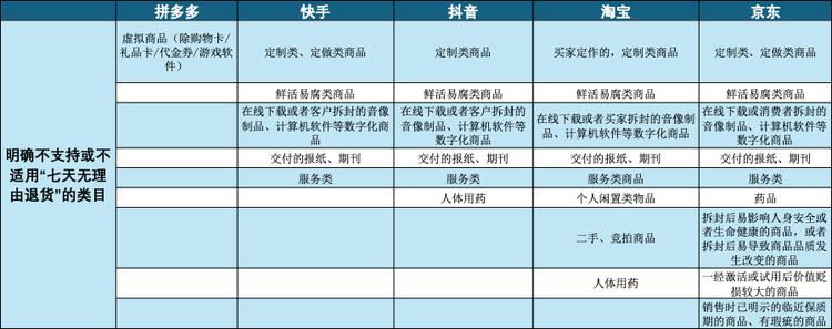 大致上,以明确不支持、不适用“七天无理由退货”的类目来看,拼多多只涉及除购物卡、礼品卡、代金券、游戏软件之外的虚拟商品,快手则包括“定制类、定做类商品”等五大类。抖音在快手基础上增加了“人体用药”,淘宝则在抖音基础上加入了“个人闲置类物品”和“二手、竞拍商品”两个类目。