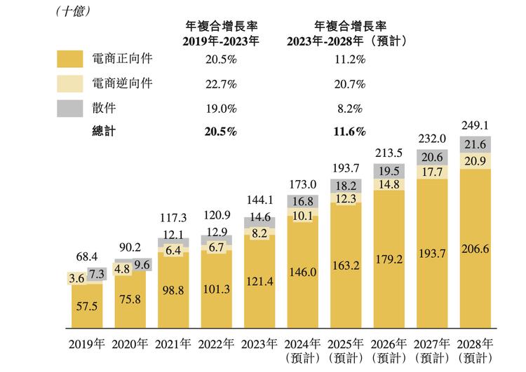 “自2019年到2023年,中国快递行业中的电商逆向件年复合增长率是22.7%,预计2023年到2028年的年复合增长率是20.7%。以规模而论,电商逆向件在2019年的规模是36亿件,2023年是82亿件,预计在2028年增长到209亿件。”