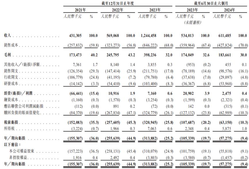 2021年、2022年、2023年及2024年1-6月(简称“报告期”),公司的总收入分别为4.3亿元、5.69亿元、12.4亿元、6.1亿元,其中2021年至2023年的复合年增长率为69.9%。